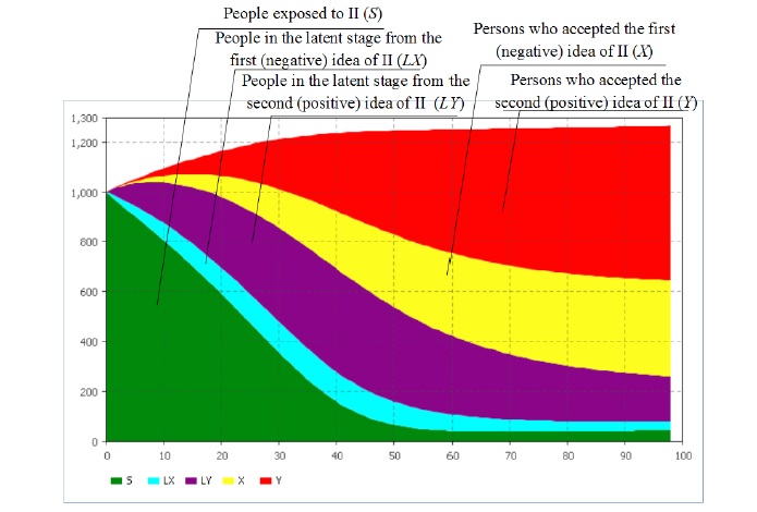 Fig. 8. The dynamics of the number of people, “infected” with the II idea,