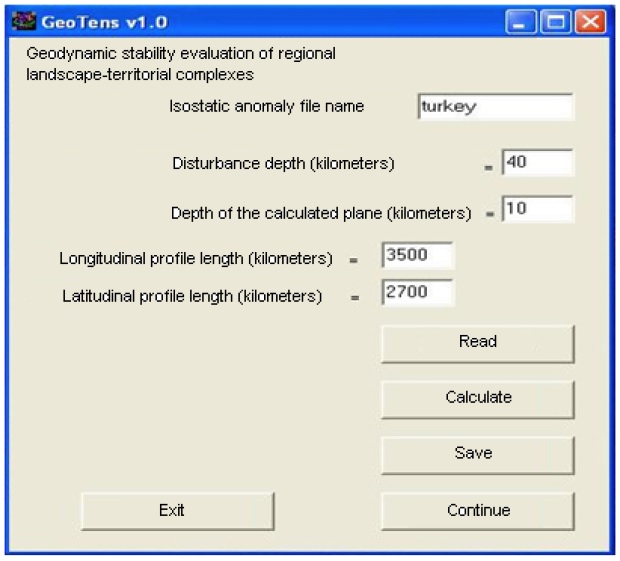 После запуска программа запрашивает имя файла изостатических аномалий, которое нужно обязательно ввести, поскольку именно в этом файле в формате системы GEOGRID размещена информация о внешней вертикальной нагрузке, действующей на среду РПТС. Также необходимо ввести глубины (в км), на которых расположены условная граница возмущений и расчетная плоскость. После ввода с клавиатуры длин (в км) долготного и широтного профилей необходимо нажать на кнопку «Прочитать». При этом происходит считывание данных из файла изостатических аномалий, и программа готова к выполнению расчетов. Расчеты производятся после нажатия на кнопку «Рассчитать».