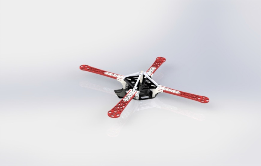 Проектирование несущей системы квадрокоптера осуществлялось в среде SolidWorks. За основу взята конструкция F-450 на базе APM. Было рассмотрено несколько проектных решений, которые подробно изложены авторами в другой статье [13]. На рис. 2 показано фотореалистическое изображение 3D-модели конструкции8.