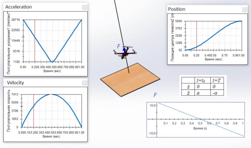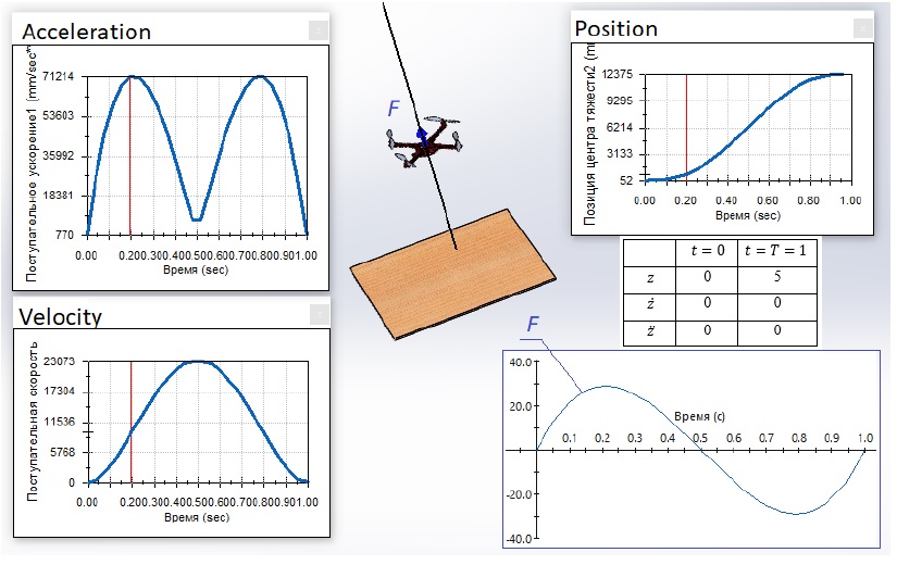 Рассмотрим случай , т. е. найдем траекторию для вертикального полета из условия минимума ускорения (minimum acceleration). На рис. 4 представлены результаты моделирования этой задачи в среде SolidWorks Motion с соответствующими граничными условиями для ͘z и ̈z в начальной (t = t0) и конечной (t = T) точках полета.
