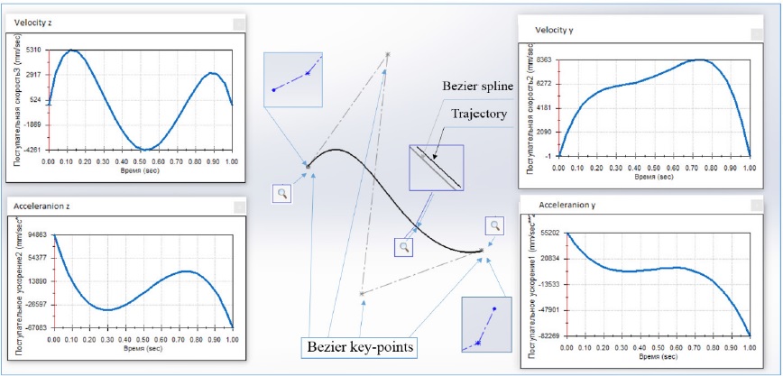 На рис. 6 показаны результаты планирования траектории полета по кривой Безье с шестью ключевыми точками в вертикальной плоскости. Показаны также три области многократного зуммирования, помеченные символом «лупа»: для областей в окрестности начальной и конечной точек сплайна. Видно, что пары первой и второй, а также последней и предпоследней точек близко расположены друг к другу. Третья область показывает исходную кривую (Bezier Spline) и фактическую траекторию полета (Trajectory), построенную в результате анализа движения, выполненного в среде SolidWorks Motion; эти кривые близки друг к другу. В качестве внешних воздействий рассматриваются управления, построенные на основе плоской системы управления [17], а функции y(t) и z(t) заданы уравнениями (3). На рис. 6 показана траектория движения, графики скоростей и ускорений центра тяжести аппарата в каждом из координатных направлений11.