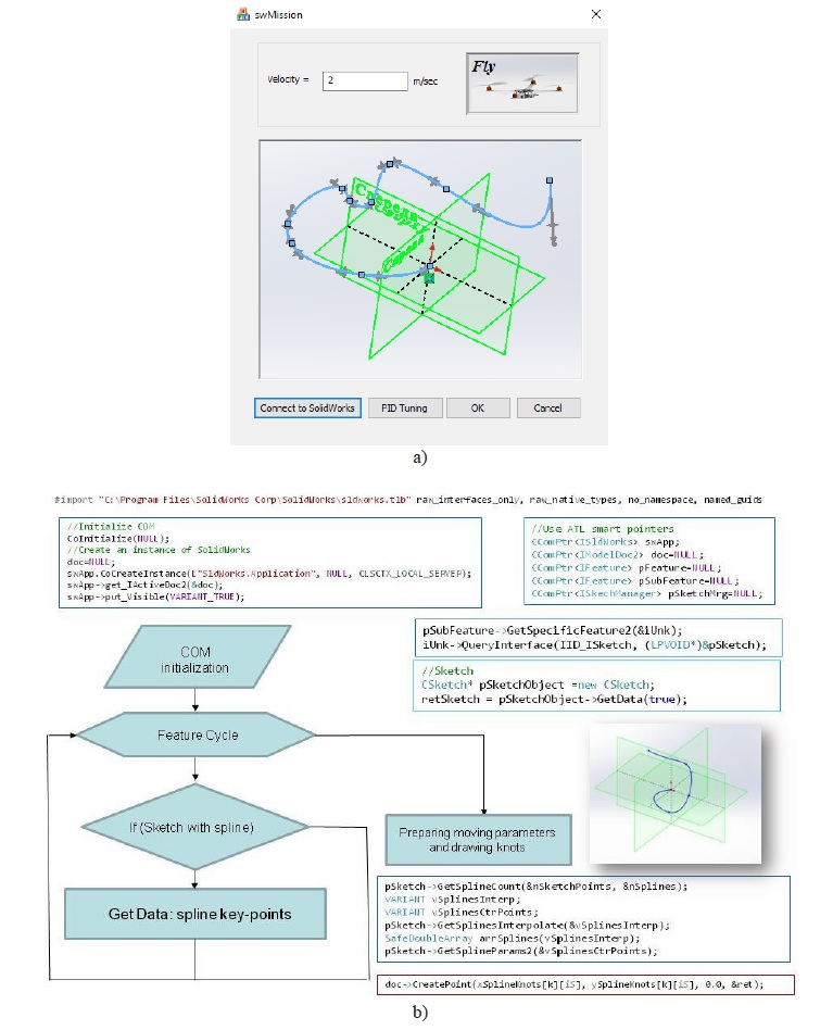 На рис. 7, а представлен пользовательский интерфейс приложения для решения задачи планирования траектории в среде, интегрированной с SolidWorks; на рис. 7, b – блок-схема алгоритма решения этой задачи: