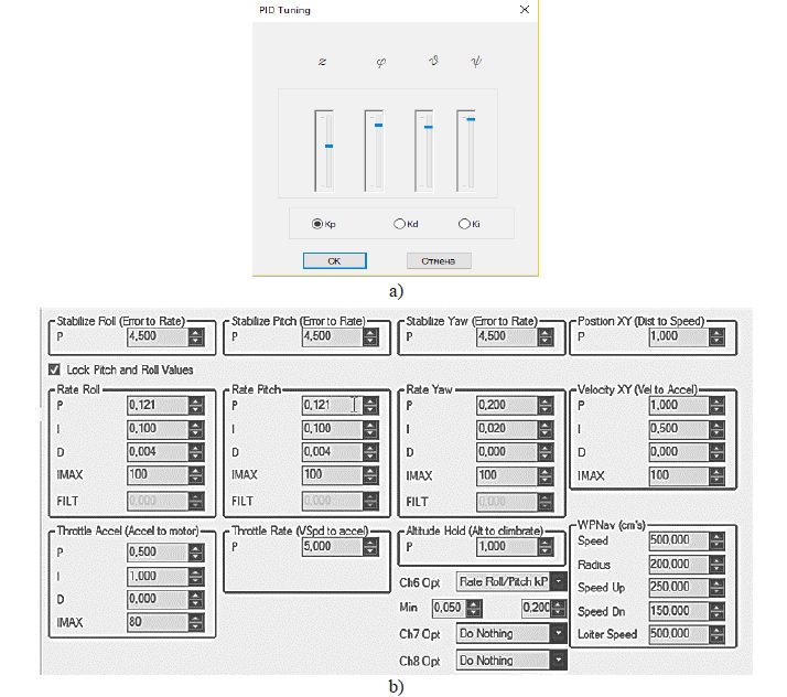 В качестве значений коэффициентов по умолчанию принимаются значения, соответствующие настройкам натурной модели (MissionPlanner; рис 8, b), а регуляторы запрограммированы на возможное изменение этих значений на 50 % вверх и вниз.