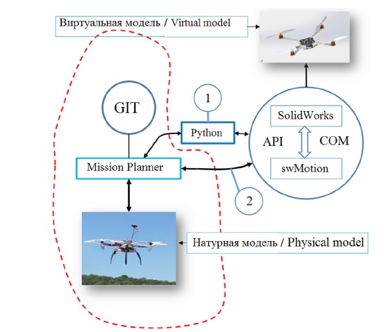 Программа управления может быть загружена в полетный контроллер как непосредственно программой MissionPlanner, так и с использованием скриптов Python19. Существенным недостатком данного подхода являются сложности создания двунаправленных ассоциативных связей между натурной и виртуальной моделями. В частности, swMotion должен получать доступ к телеметрической информации, передаваемой в MissionPlanner системой GPS натурной модели.