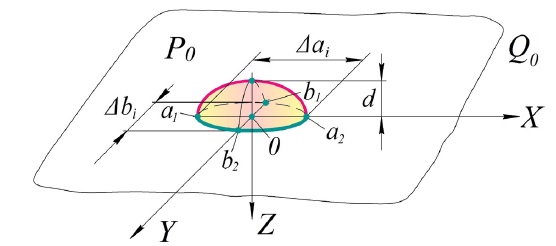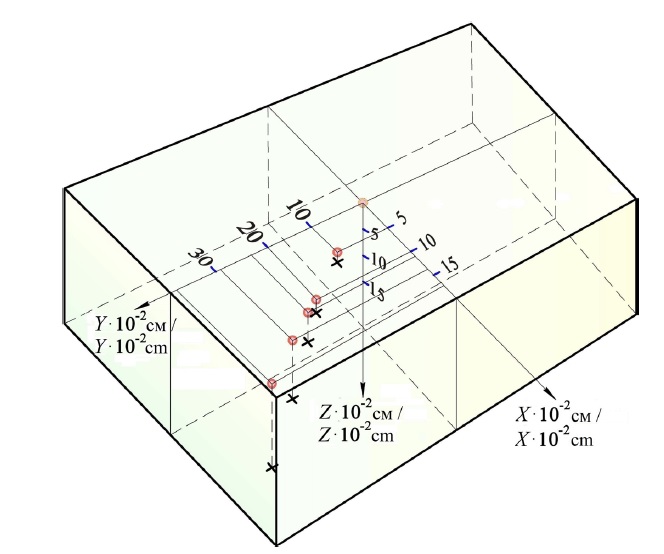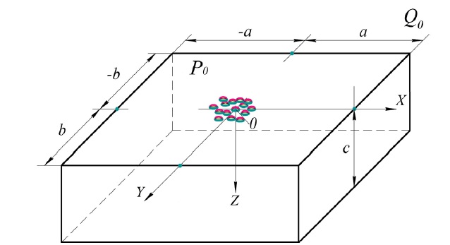 Рассмотрена задача нагрева катода, имеющего форму прямоугольного параллелепипеда (Q0 = {(‒a,a)×(‒b,b)×(0,c)}), в декартовой системе координат при ЭИЛ (рис. 1). Здесь P0 = – рабочая поверхность; q0 = q0{x,y,t} = q0{x',t} – поверхностный тепловой поток; t – время; N – количество капель [20].