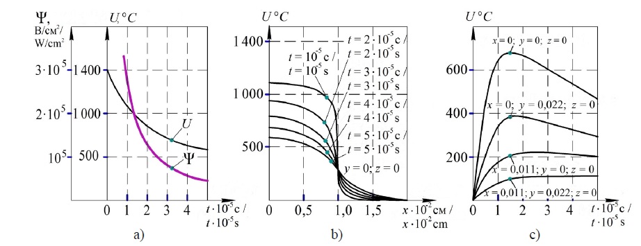 На рис. 4 представлена динамика температурного поля и вычисляемого потока в соответствии с формулой (5). Кривые на рис. 4, а иллюстрируют убывание температурного поля начала координат (линия U) и потока (линия ψ). На рис. 4, b показана динамика температурного поля сечения y = 0, z = 0; на рис. 4, c ‒ динамика точек, расположенных вне основания капли [Там же].