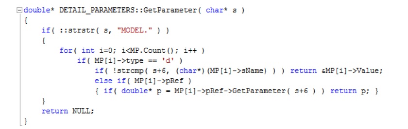 Формулы, связывающие параметрические переменные, могут содержать алгебраические и тригонометрические функции, логические операции и скобки. В результате лексического анализа распознаются последовательности символов (лексемы), которые потенциально могут являться именами параметров. Для получения числового значения параметра используется виртуальная функция GetParameter базового класса, которая переопределяется в производных классах. Метод DETAIL_PARAMETERS::GetParameter (рис. 5) принимает на вход лексему и возвращает адрес соответствующей переменной типа double. Использование указателей на переменные обеспечивает получение актуальных значений параметров. Нулевое значение адреса означает, что параметр по входному имени не обнаружен. Аналогично работает и метод DETAIL_PARAMETERS::GetParameterStr, возвращая адрес первого символа строки, если параметр содержит текстовое значение.