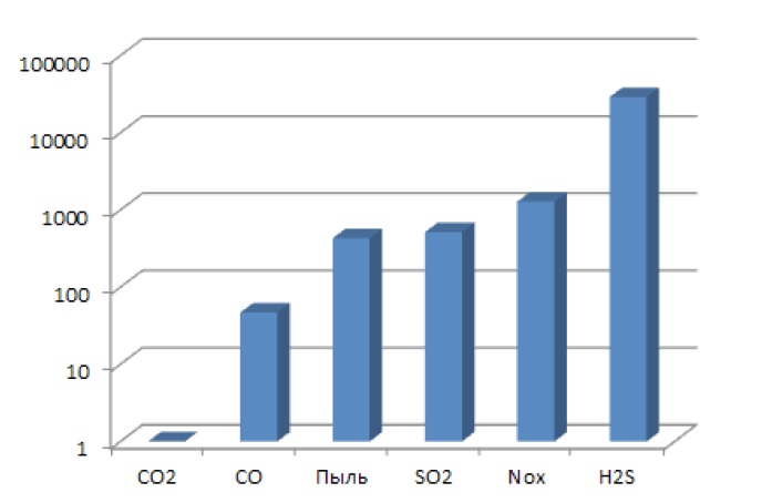 Полученные значения kui позволяют оценить значимость негативного влияния веществ-загрязнителей на окружающую среду. Так, можно сделать вывод о том, что наибольшее негативное воздействие на окружающую среду оказывает сероводород (H2S), а наименьшее – диоксид углерода (CO2). Также, сравнивая между собой весовые коэффициенты, можно определить относительную значимость с точки зрения негативного воздействия на окружающую среду: например, весовой коэффициент оксидов азота в 9,17 раз больше коэффициента диоксида серы; это означает, что оксиды азота оказывают в 9,17 раз больше негативного влияния на окружающую среду, чем та же масса диоксида серы.