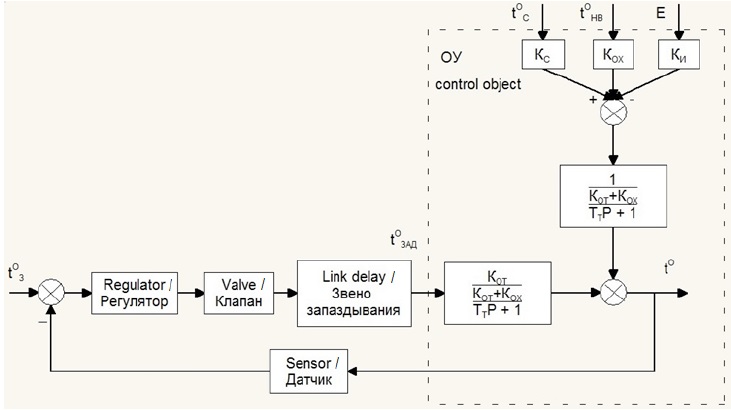 Приведение исходной модели температуры воздуха в теплице (1) и соответствующей структуры ОУ к виду, удобному для исследования параметрической неопределенности модели и возмущающих воздействий, проделано путем формального алгебраического преобразования уравнения теплового баланса (1) и по правилам эквивалентных преобразований структурных схем линейных САУ. В результате преобразований получена структура реальной системы управления температурой в теплице (рис. 2), в которой в более определенной структуре ОУ сосредоточенно на выходную координату через апериодические звенья с постоянной времени TT в секундах, равной отношению TT = kT /(kОТ + kох), действуют управление и возмущения, исключена внутренняя обратная связь, в канал управления температурой введены регулирующий, исполнительный и измерительный элементы, а также учтено запаздывание в движении теплоносителя.
