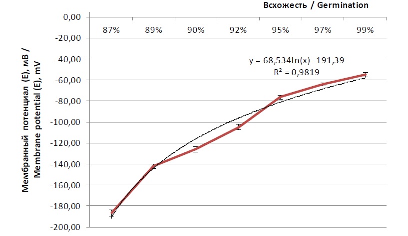Перед проведением измерения мембранного потенциала был проведен контрольный тест всхожести по методам ISTA. Из партии образцов часть семян отправили на прорастание для проверки и установления их всхожести [24] в соответствии с правилами, установленными Международной ассоциацией по контролю качества семян (ISTA) [1]. Семена помещались на двух слоях фильтровальной бумаги в чашках Петри. Бумага предварительно смачивалась водой. Через семь дней при 20 ± 1 °C были проведены подсчеты проросших семян. В соответствии с количеством проросших семян установлен процент всхожести. Были получены идентичные проценты всхожести в лаборатории Россельхозцентра.