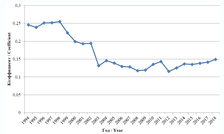 Суммарное количество докторов наук, защитившихся в период с 1976 по 1993 год, было аппроксимировано исходя из предположения о сохранении соотношения числа защит кандидатов и докторов наук. На рисунке 3 представлены значения отношения количества защитившихся докторов наук к количеству кандидатов наук в 1994–2018 гг. Можно увидеть, что в 1994–1998 гг. этот коэффициент в среднем составлял 0,25, а в последующие годы он понизился до 0,12. Поэтому для расчета количества защитившихся докторов наук за период с 1976 по 1993 год был использован коэффициент 0,25.