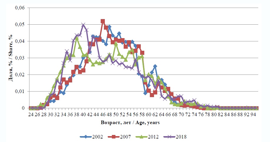 Fig. 4. Percentage of persons awarded degree of Candidate of Sciences by age in 2002, 2007, 2012 and 2018