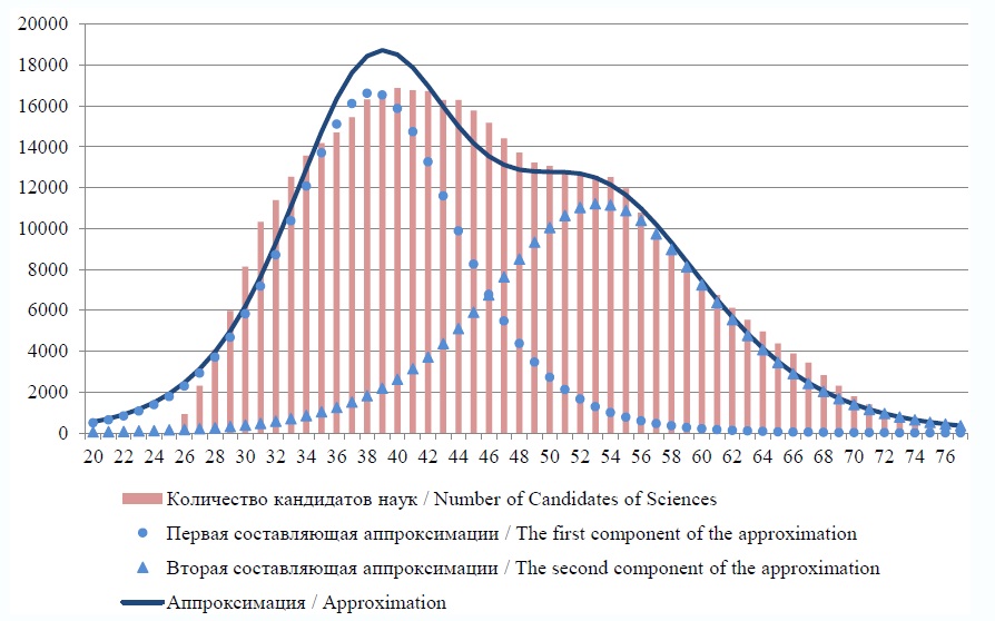 Обсуждение и заключение. Предложенные модели показали свою адекватность. Были получены оценки численности кандидатов наук в возрастных категориях 20–80 лет – 468 тыс. человек; докторов наук в возрастных категориях 30–90 лет –72 тыс. человек. Построенные аппроксимирующие функции позволяют получить число кандидатов и докторов наук в любом возрастном диапазоне. Поскольку система кадров высшей научной квалификации достаточно инертная, то полученная возрастная структура кадров высшей научной квалификации сохранит свой характер еще на протяжении как минимум 10 лет. Полученные оценки численности лиц с учеными степенями позволяют охарактеризовать кадровый потенциал для принятия решений в сфере управления высокотехнологичными секторами экономики.