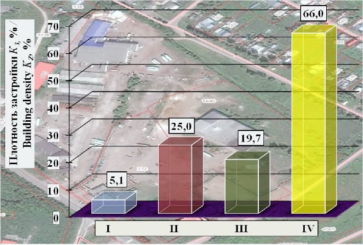 Плотность застройки КЗ определялась в процентах как отношение площади застройки АЗ к площади предприятия АП: