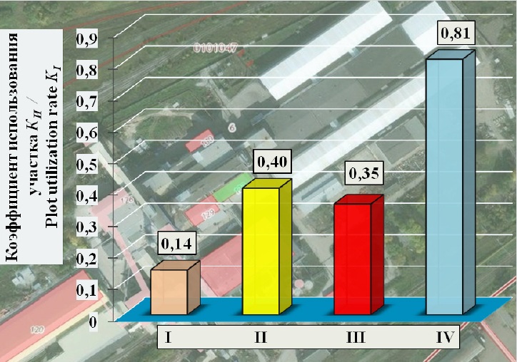 Сравнение фактической величины коэффициента использования участка КИ и минимальной величины коэффициента использования участка площадок сельскохозяйственных предприятий (равна 0,40), выявило, что у 62 % РОБ предприятий технического сервиса он не превысил рекомендуемой в специальной литературе [11; 11] величины.