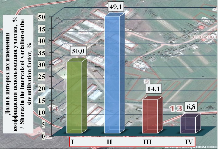 Результаты исследования. Результаты исследований фактической плотности застройки для предприятий технического сервиса показали, что она в 65 % случаев ниже минимальной плотности застройки, установленной сводом правил СП 19.13330.2011. Фактическая плотность застройки ремонтно-обслуживающих баз находится в интервале 5,1–66,0 %. При этом фактическая средняя плотность застройки предприятий технического сервиса сельхозпроизводителей составила 19,7 %. Наибольшее количество предприятий (61,9 %) имеют плотность застройки 5–20 %, то есть значительно ниже нормативной величины. Наименьшее число предприятий (3,6 %) имеют плотность застройки свыше 50 %. Большинство предприятий (58,5 %) имеют площадь озеленения менее 10 %, что ниже регламентированного значения. Это характеризует рассматриваемые площадки с экологической точки зрения как не соответствующие современным требованиям. В результате сравнения фактической величины коэффициента использования участка предприятий и минимальной величины коэффициента использования участка площадок сельскохозяйственных предприятий выявлено, что у 62 % ремонтно-обслуживающих баз предприятий технического сервиса он не превысил рекомендуемой в специальной литературе величины.