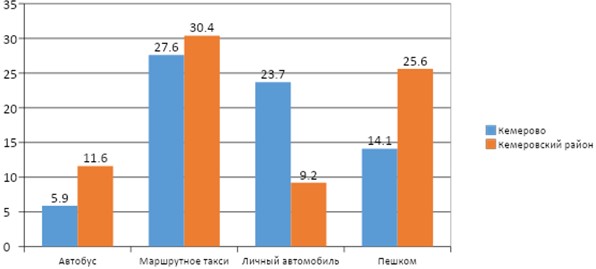 В частности, наиболее используемыми видами транспорта среди опрошенных жителей города и пригорода являются личный автомобиль, автобус, маршрутное такси. При этом пешком и на автобусе чаще перемещаются жители района, а вот личный автомобиль выбирают горожане (рис. 1).