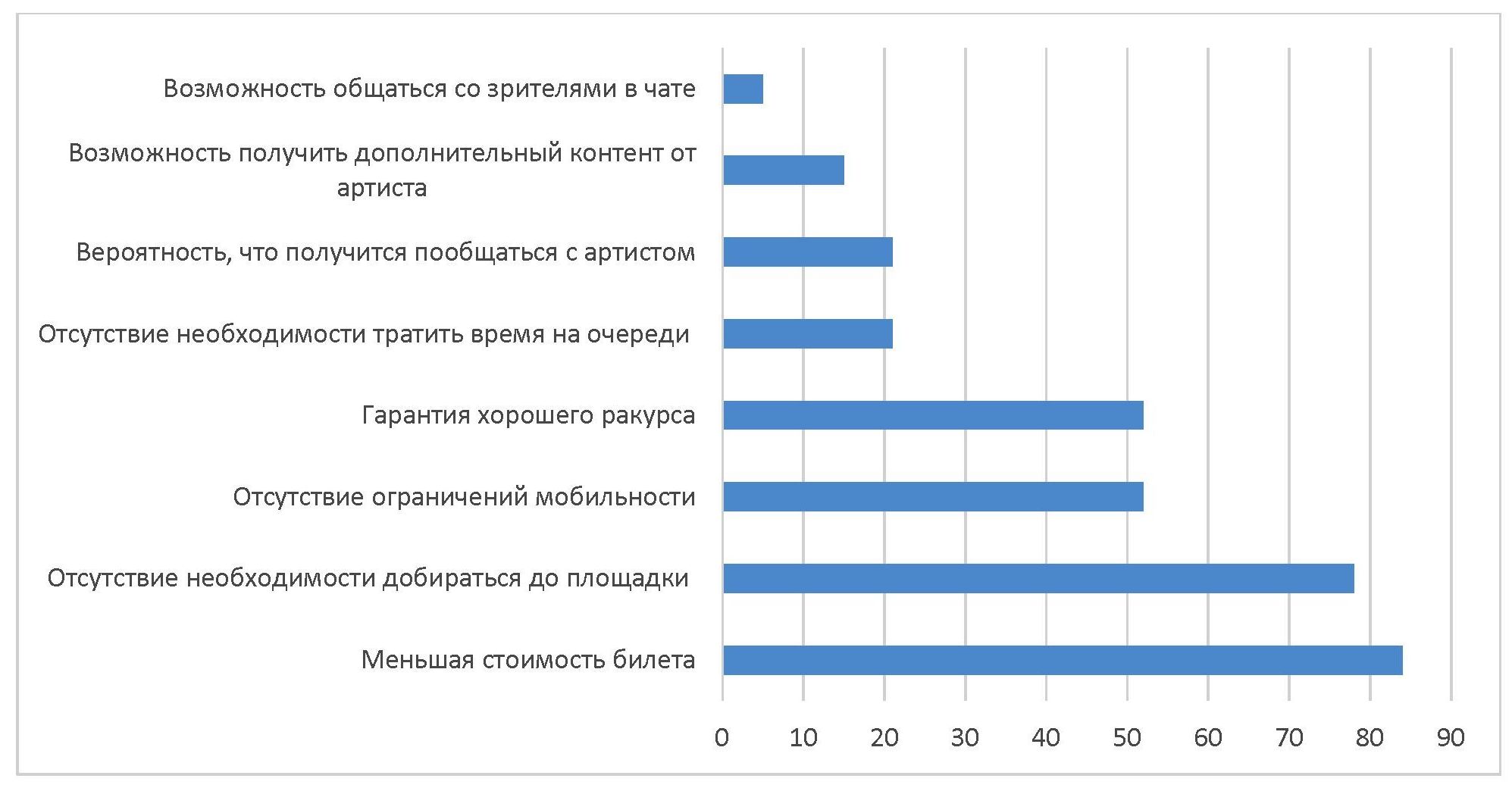 В числе возможных преимуществ онлайн-концертов респонденты отмечали меньшую стоимость билета (84 %) и отсутствие необходимости добираться до площадки проведения концерта (78 %). Отсутствие ограничений мобильности, связанных с посещением концерта и хороший ракурс как преимущество отметили одинаковое количество респондентов (52 %). Отсутствие необходимости траты времени на очереди (21 %), большая вероятность взаимодействия с артистом (21 %), дополнительный контент от артиста (15 %), возможность общаться со зрителями посредством чата (5 %) являются наименее популярными преимуществами, по мнению респондентов (рис. 2).