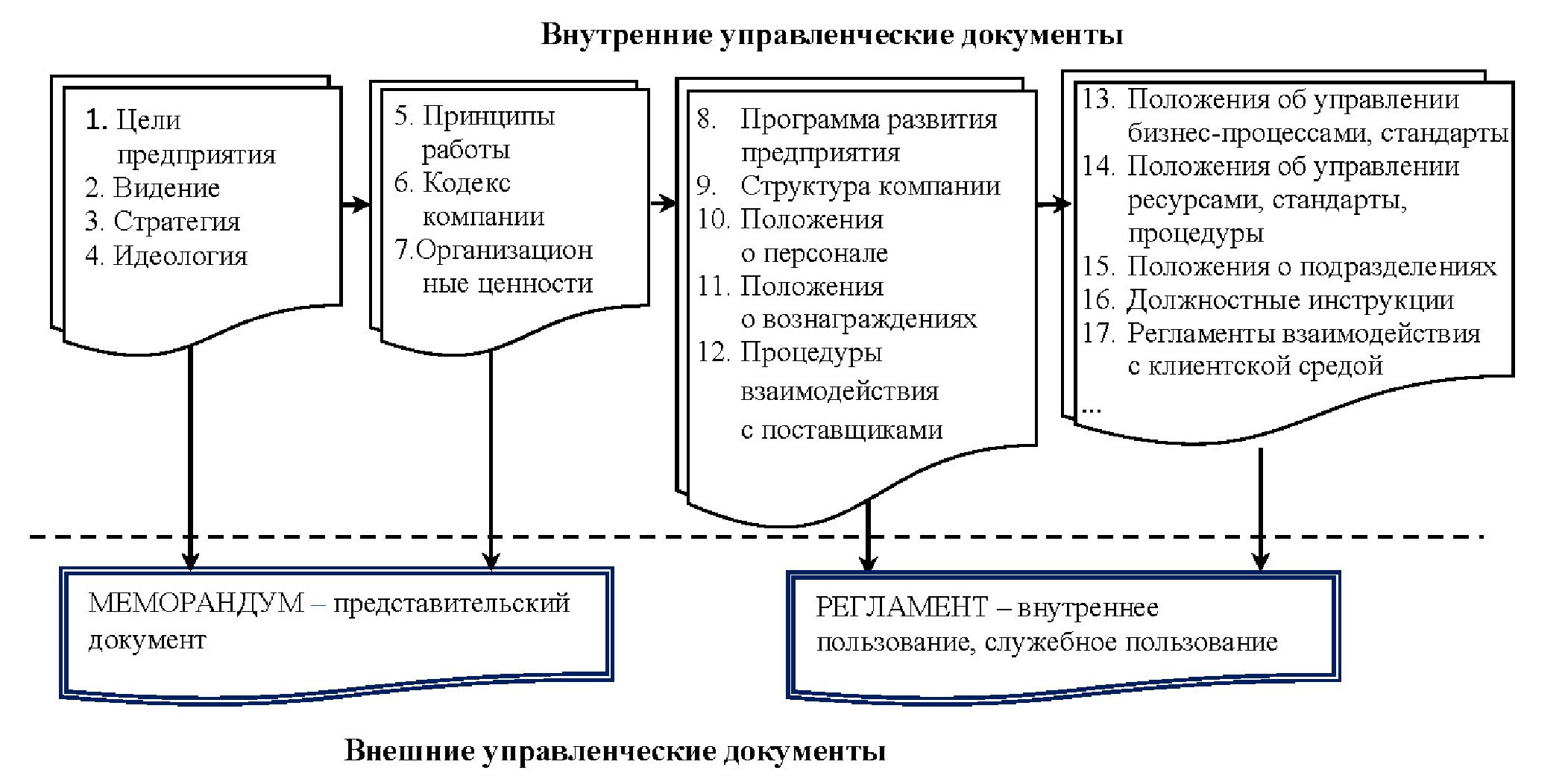 Во-вторых, потенциальные партнеры и клиенты должны иметь ясное представление о ключевых компетенциях и предприятии в целом. В дополнение к внутренней документации на предприятиях обычно требуется наличие двух внешних управленческих документов – «Меморандума» и «Регламента». Однако исследования среднего бизнеса показывают, что многие отечественные предприятия ограничиваются только той организационной документацией, которая им необходима с юридической точки зрения. Работа с другими документами воспринимается как лишние затраты, и их общая значимость не всегда ясна. Можно говорить о необходимости формирования доступной и понятной во внешней среде деловой документации российских предприятий.