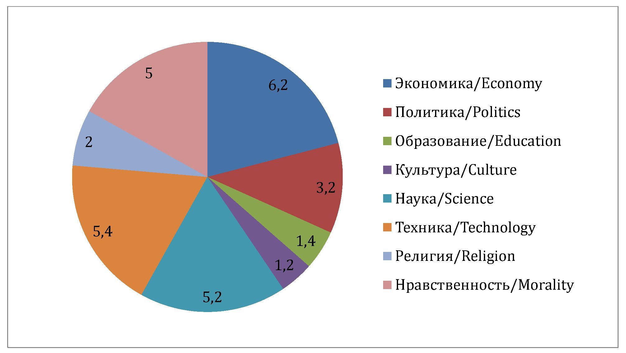 Анализ диаграммы показывает, что по результатам опроса доминирующей сферой является экономика − 62 %. Далее наибольший охват в динамике цифровизации представлен следующими сферами: наука, техника и нравственность, наименьший охват − религия и культура.