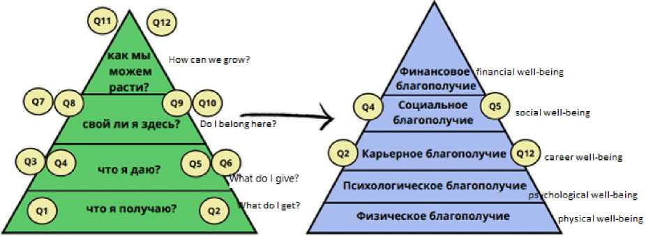 Одной из популярных методик измерения уровня вовлеченности сотрудников является опросник Gallup Q12. Структура опросника представлена на рис. 2. Каждый из 12 вопросов соответствует одному из четырех уровней в этой иерархии. На основе подхода Gallup, включающего пять факторов благополучия, и опросника Q12 была разработана анкета для определения уровня вовлеченности сотрудников на примере томской организации.