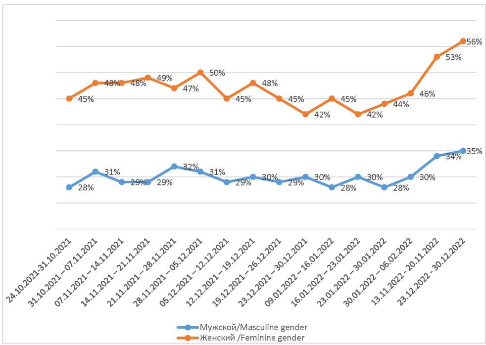 Анализ тревожности в гендерном измерении показывает, что женщины являются более тревожной группой населения. Так, например, А.В. Палкина и Н.Э. Соболева, измеряя уровень тревожности в период пандемии, выявили, что его среднее значение у женщин почти в 2 раза выше, чем у мужчин. Авторы связывают это с тем, что женщины столкнулись с проблемами «теневой пандемии» (расширение круга домашних обязанностей и учащение случаев домашнего насилия). Помимо этого, женщины оказались в ситуации, когда их сферы занятости больше пострадали от пандемии (например, сфера торговли). Стабильность гендерных различий подтвердилась тем, что различия в уровне тревожности российских мужчин и женщин оставались практически неизменными на протяжении 2020–2021 гг. [18].