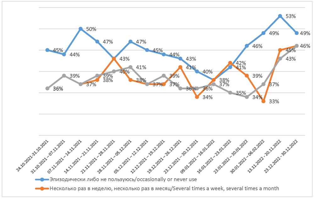 Первое – как правило, это люди старших возрастов3, которые, как было отмечено выше, отличаются стабильно повышенной тревожностью. Второе – интернетом реже пользуются люди без профессионального образования4, которые также относятся к группам риска. Наконец, интернет как источник информации дает больше возможностей находить альтернативные данные, анализировать их и формировать более рациональные оценки социальной ситуации, что снижает уровень тревожности. Если посмотрим на график динамики тревожности, соответствующий группе респондентов, ежедневно пользующихся интернетом, то увидим, что в 2021 г. он был более стабилен, по сравнению с другими, а в 2022 г. хоть и подвергся колебаниям, но в меньших пределах значений, чем в другие. Таким образом, россияне, которые регулярно пользуются интернетом, отличаются более устойчивым эмоциональным состоянием.