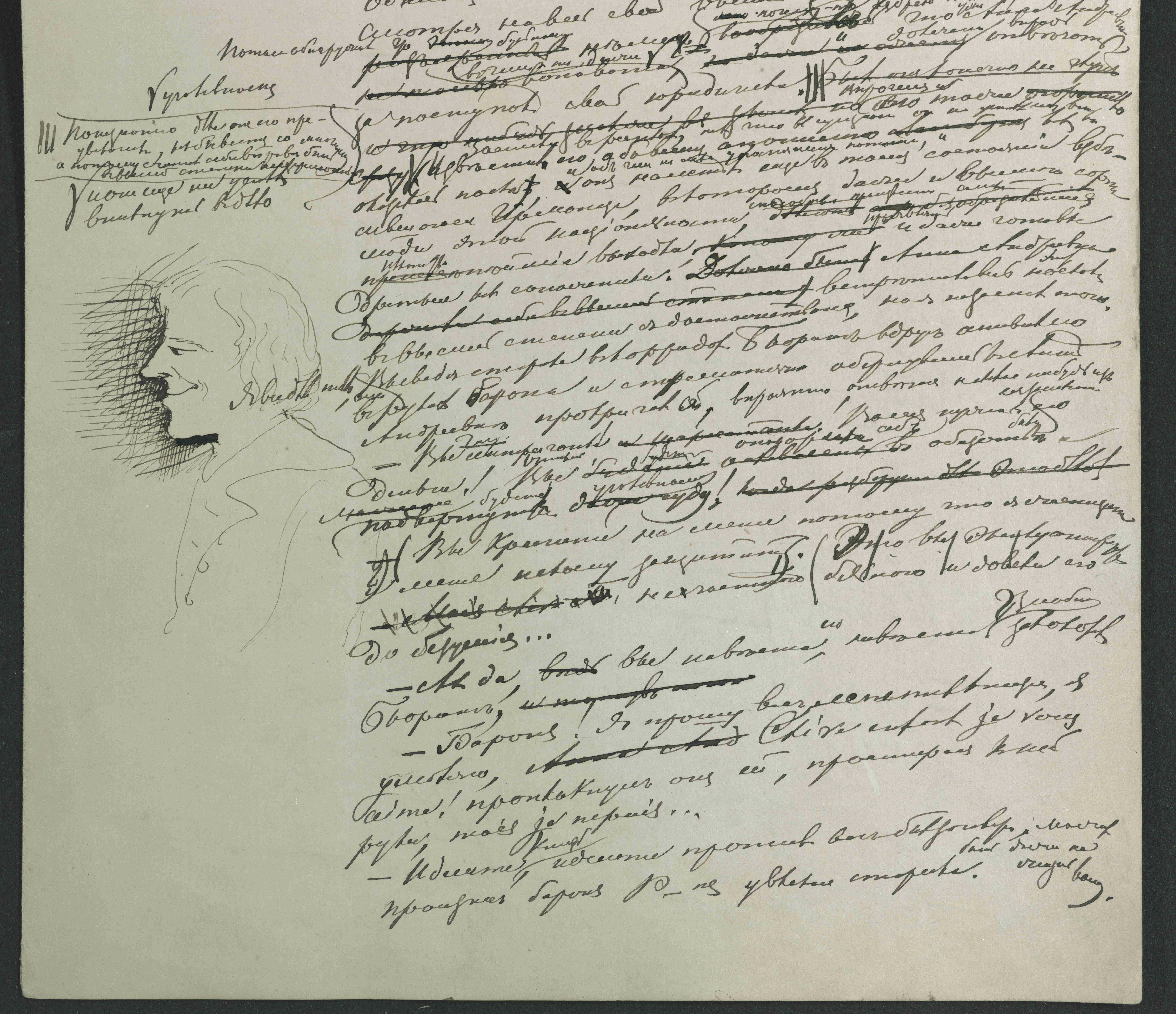Изображение профиля Вольтера в рукописи романа «Подросток» (начало раздела II 12 главы Третьей части) [Достоевский, 1972–1990, т. 13, с. 436]