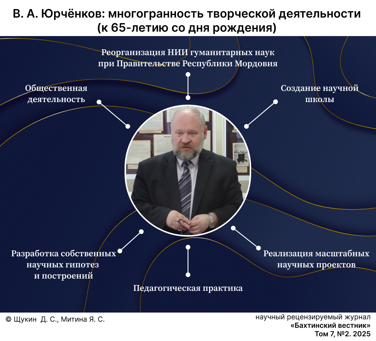 Results and Discussion. This article examines key areas of V. A. Yurchyonkov’s work: the reorganization of the Research Institute of Humanities under the Government of the Republic of Mordovia, the creation of an academic school, the implementation of large-scale research projects, the development of his own scientific hypotheses and constructs, public activities, and teaching practice. It shows that V. A. Yurchyonkov, distinguished by his unique scholarly erudition and professionalism, was a broad-based scholar in the humanities and a conceptualist who defined the essence of the development of Mordovia regional history as an integral part of a single all-Russian historical process. The scholar defines the configuration of the historical development of the Mordovian people and the Mordovia region within the framework of his concept of the formation of the Mordovians as a “pulsating” ethnic group, as well as in the context of the multidirectional and varying in strength, yet stable, interaction between the Russian center and periphery. V. A. Yurchyonkov is known as an educator and organizer of science. The academic school he founded includes many researchers successfully working at the intersection of history, cultural studies, ethnology, ethnosociology, historiosophy, and other disciplines. He is also the author of fiction and the screenwriter of short historical documentary films. The scholar was a true patriot of his native land and a consistent promoter of Mordovia history and culture. V. A. Yurchyonkov’s creative public stance and his work aimed at preserving the memory of military and historical events, developing memorial practices, and promoting the cultural achievements of Mordovia continue to resonate deeply with his colleagues in the republic. He has received well-deserved recognition at the Russian and international levels.
