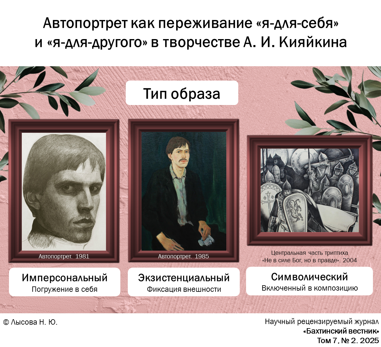 Materials and Methods. The study focuses on Kiyaikin’s graphic and painted self-portraits. Art history (formal and iconographic) and cultural studies (cultural hermeneutics) methods are employed. The study is embedded within the framework of M. M. Bakhtin’s conceptual understanding of the self-portrait phenomenon, ranging from “self-for-myself” to “self-for-others”.