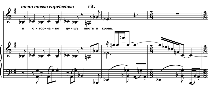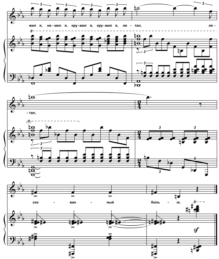 «Скованный болью» – причудливая игра стихотворной светотени: «В сплетении лилий – ты ли, не ты ли». Текст декламируется практически на одном звуке: в первой октаве в диапазоне «h-c-d-e»; в следующих строфах: «e-f-g-a», и далее, переходит во вторую октаву, повторяя первоначальный музыкальный рисунок.