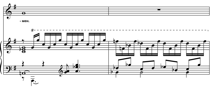 В «Постлюдии» уже нет и намека на бурю чувств. Все, действительно, завершилось.   Как и в начале, мы слышим мягкое, убаюкивающее звучание флейты. Она негромко разговаривает с роялем, нежно вторящим ее интонациям. Задуваются свечи. Опускается занавес (рис. 18).
