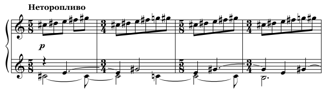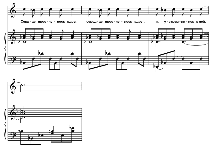 В «Дежа вю» красота и гармония окружающего мира внезапно исчезают, на их место приходит оглушительное чувство первой любви. Дафнис рассказывает о нем как о чем-то незнакомом, но давно ожидаемом, словно это «весть бессонных ночей, весть бессонных ночей в ясный солнечный день, в ясный солнечный день». В яркой вспышке эмоций герой настойчиво повторяет один и тот же мотив (рис. 4).