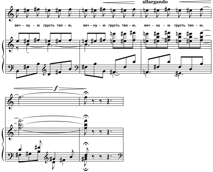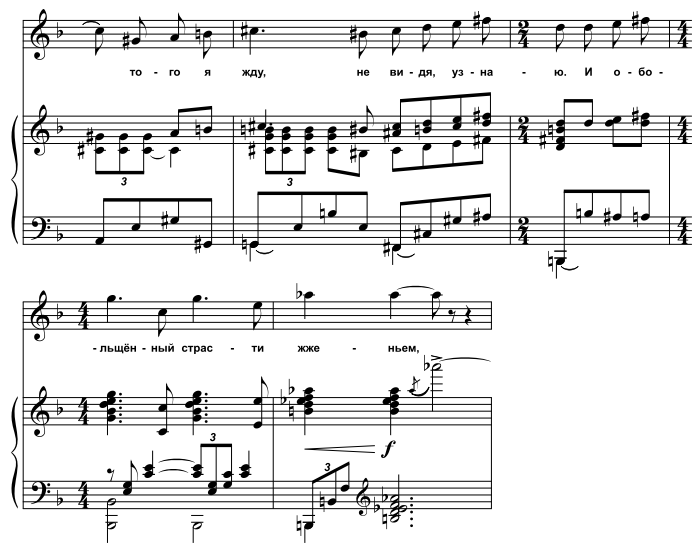 «Тому, кто очарован мной…» – элегическое размышление, повесть израненного сердца. Красива тема вступления. Она повествовательна и экспрессивна. Вокальная партия развивается в восходящем движении с постепенным увеличением динамики. Кульминация сопровождается аккордами, октавными удвоениями, диссонансными созвучиями рояля. Фактура становится плотной и насыщенной (рис. 16).