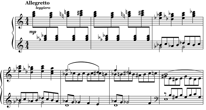 В «Признании Дафниса» музыка тиха и нежна, ее отличительные черты – плавные «покачивания» мелодических секст и большая метрическая свобода (3/8; 5/8; 6/8; 5/8; 6/8; 3/4; 6/8; 5/8; 2/8; 6/8; 9/8; 6/8). Как и в предыдущем номере, смена психологического состояния героя отражена в тональном сдвиге от G-dur к Des-dur и таинственном мерцании es-moll и Ges-dur, завершающем пьесу (рис. 11).