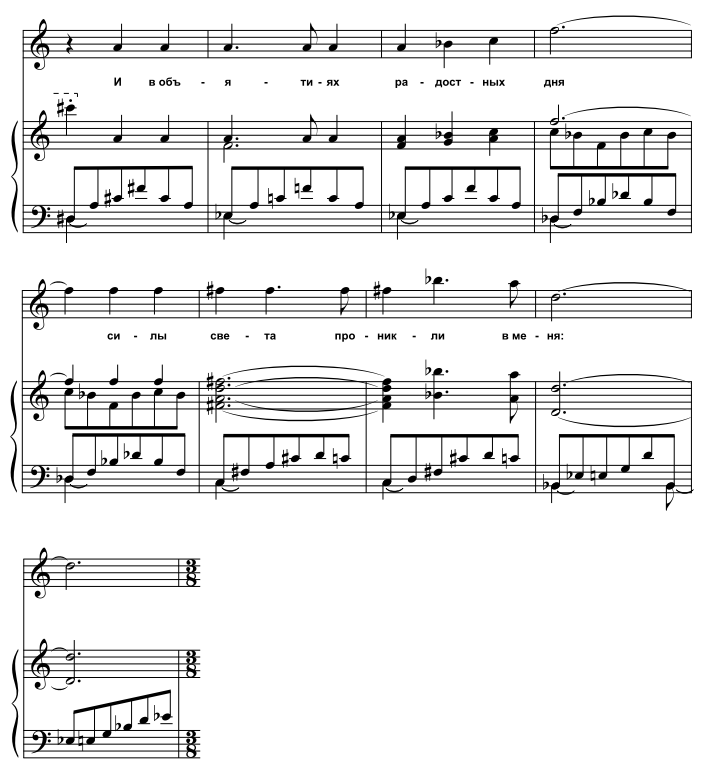 Отрешенность и иллюзорность чувствуются в сложно интонируемой партии солиста, в многочисленных тритонах и энгармонизмах. Подвижен и психологический портрет героя. Романтика грез уступает место восторгам разбуженного сердца: «И в объятиях радостных дня силы света проникли в меня» (рис. 8):