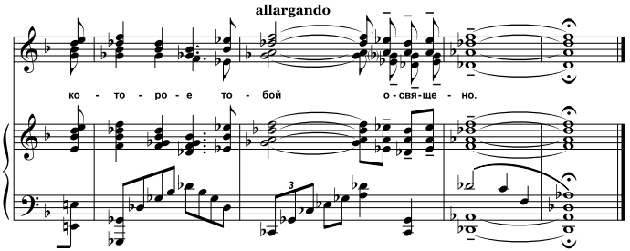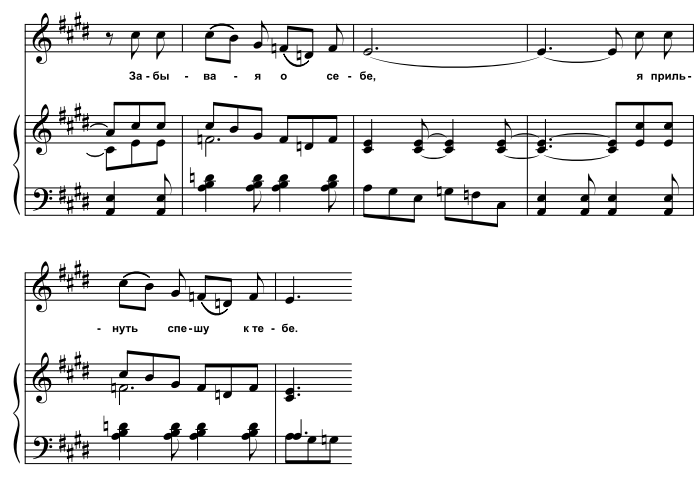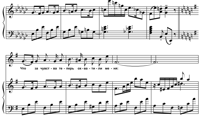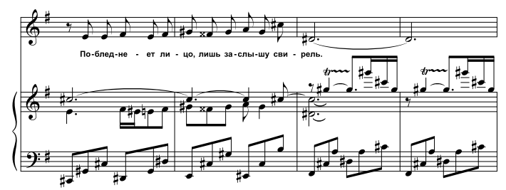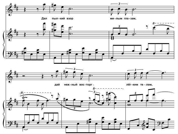 «Просьба» Дафниса  – песнь любви, бьющее через край счастье и желание рассказать о нем всему миру. Один и тот же текст «Дай пылкий взор милым глазам, дай нежный восторг – легким телам, дай розовый куст – грустным сердцам, сны синих муз – тленным цветам» повторяется дважды. Во второй раз он звучит на квинту выше в сопровождении октавных унисонов и выразительных подголосков рояля, насыщенно и мощно (рис. 14).
