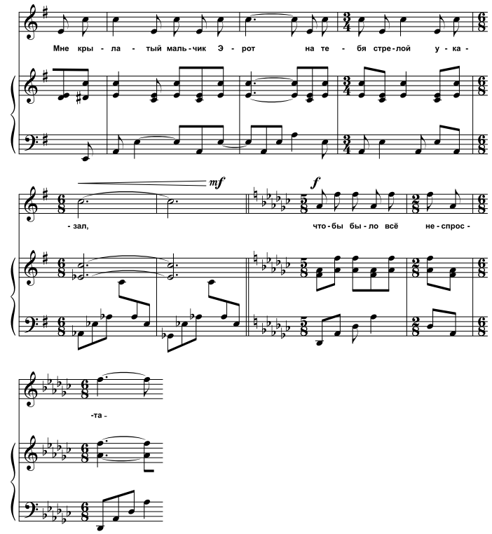 Подобный прием можно наблюдать и в кульминационном эпизоде на словах: «О, Эрот, не дай нам уснуть». Музыкальная речь Хлои почти всегда начинается со слабой доли такта, ее волнообразное движение основано на хроматическом или диатоническом опевании основного тона, передающих ее волнение и восторг (рис. 10).