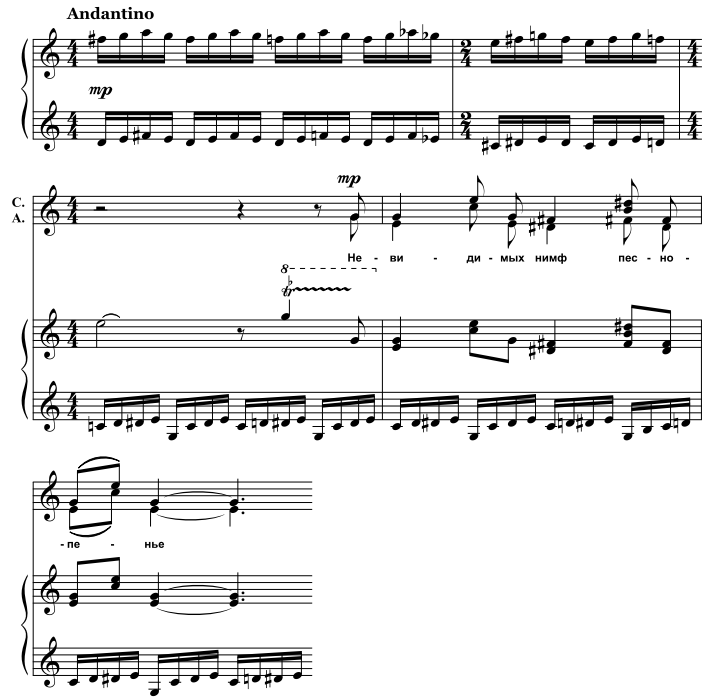 «Сад Филета» – рай для влюбленных, в нем нет тревог и волнений, лишь только «невидимых нимф песнопенье пленяет сияние дня». Кружево инструментальной фактуры сопутствует звучанию женских голосов, мелодической линии широкого дыхания и диапазона. Ее простота и изысканность напоминают о танце юных дев, частая смена метра – о свободе движения. Строфическая форма усиливает ясное восприятие музыки, а утонченная хроматика сопровождения создает своеобразную игру ладовой светотени (рис. 12).