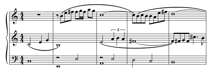 Красочными барочными иллюстрациями выглядят короткие двухтактовые проигрыши, когда на миг вся природа замолкает, и флейта Пана чутко откликается на песнь влюбленных (рис. 3).