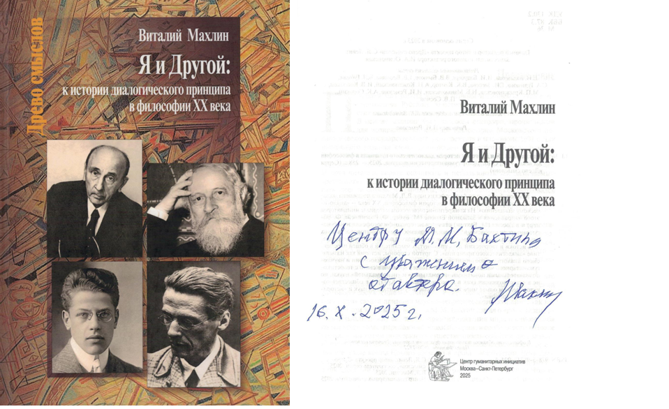 Виталий Львович Махлин – доктор философских наук, профессор, ведущий научный сотрудник отдела литературоведения Института научной информации по общественным наукам (ИНИОН РАН) подарил Центру новое монографическое исследование: «Я и Другой: к истории диалогического принципа в философии ХХ века» (М. – СПб.: Центр гуманитарных инициатив, 2025. 258 с. (Серия «Древо смыслов») (рис. 7). Книга посвящена малоизученному направлению в истории философии ХХ в. – «диалогическому мышлению». На материале работ инициаторов этого направления в Западной Европе (М. Бубер, Ф. Розенцвейг, Ф. Эбнер) и в России (М. М. Бахтин) ставится историко-философская и научно-гуманитарная проблема, имеющая два взаимосвязанных методологических решения, которые позволяют реконструировать истоки и творческий путь упомянутых мыслителей и рассмотреть диалогизм в общественно-историческом опыте мира жизни – области гуманитарных наук и «исторической философии».