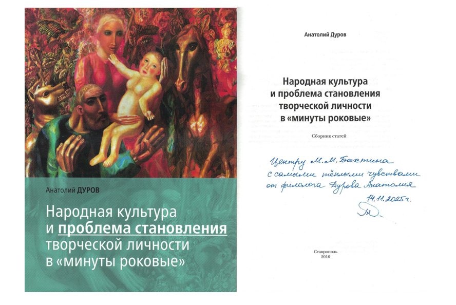 Анатолий Андреевич Дуров – кандидат филологических наук, доцент кафедры культурологии и библиотековедения Ставропольского государственного университета, режиссер Театра-лаборатории «Пятый этаж», актер Ставропольского драматического театра им. М. Ю. Лермонтова подарил Центру две свои книги.