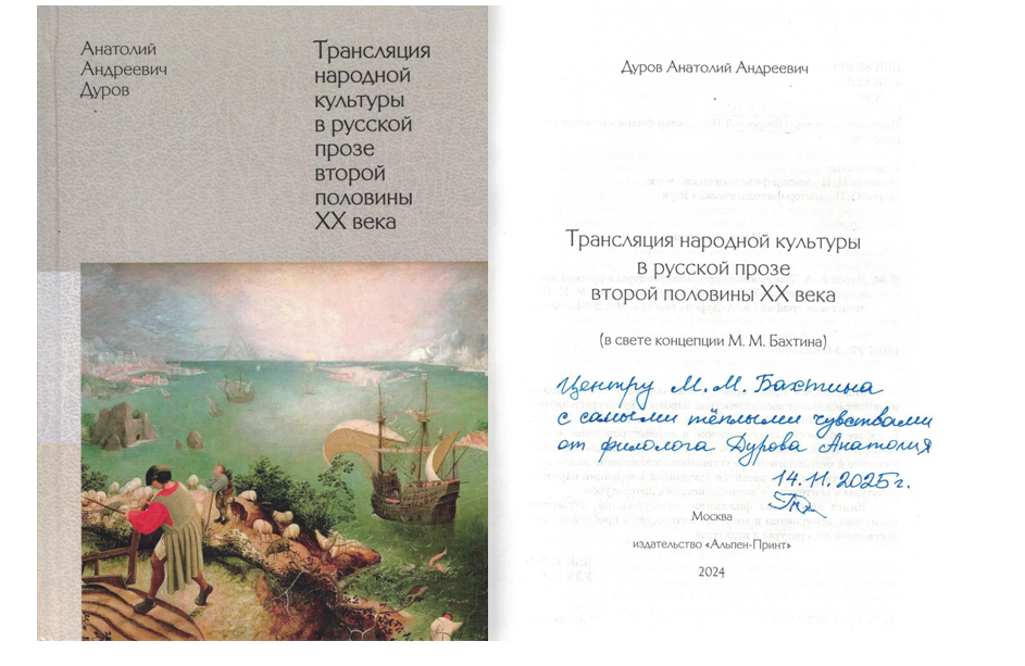 Монография «Трансляция народной культуры в русской прозе второй половины ХХ века (в свете концепции М. М. Бахтина)» (М.: Изд-во «Альпен-Принт», 2024. 464 с.) (рис. 9) представляет собой, как пишет автор, «первое в отечественной науке исследование взаимодействия народной культуры и литературы в аспекте субъектно-субъектных, диалогических отношений).