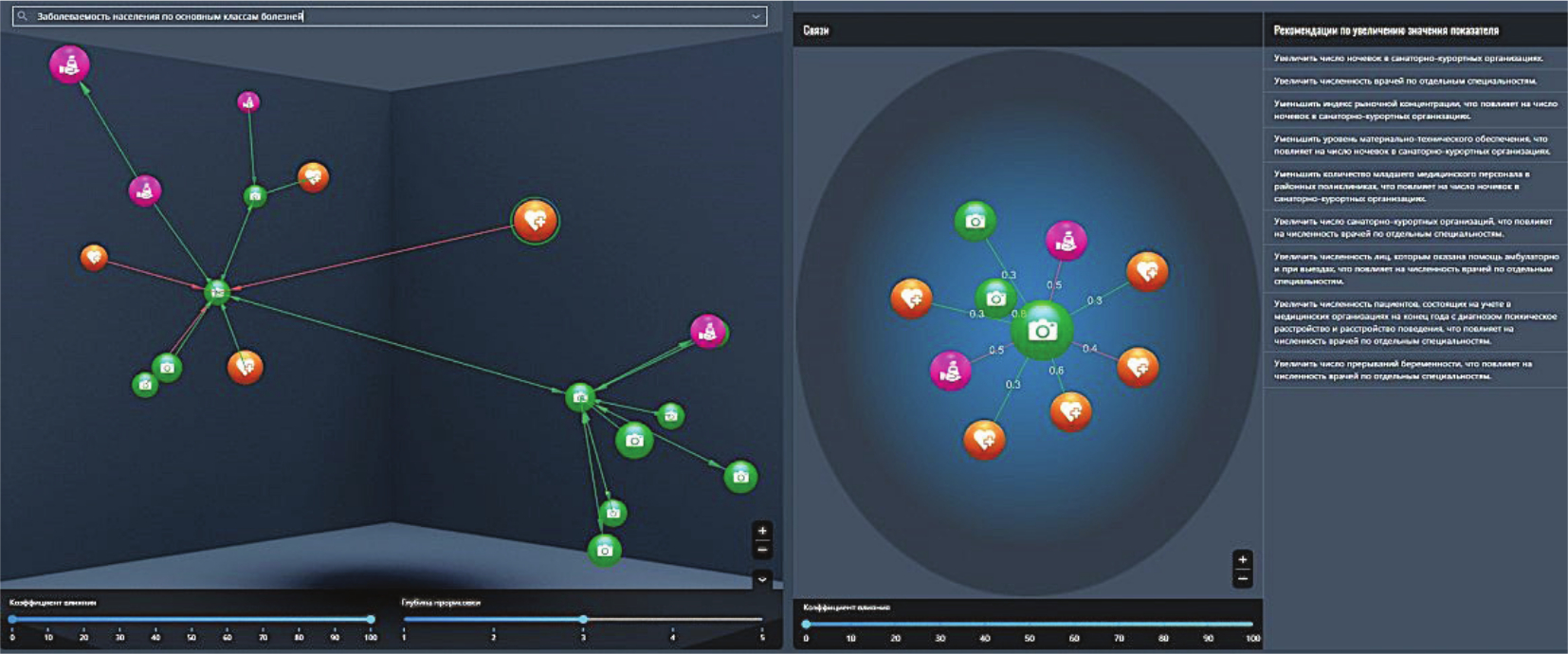 Общее решение визуализируется в виде набора множества критериев, описывающих текущую ситуацию и варианты развития событий (рис. 3). Искусственный интеллект осуществляет оценку развития ситуации в ответ на возникающие события и генерирует разные варианты решений по влиянию на нее.