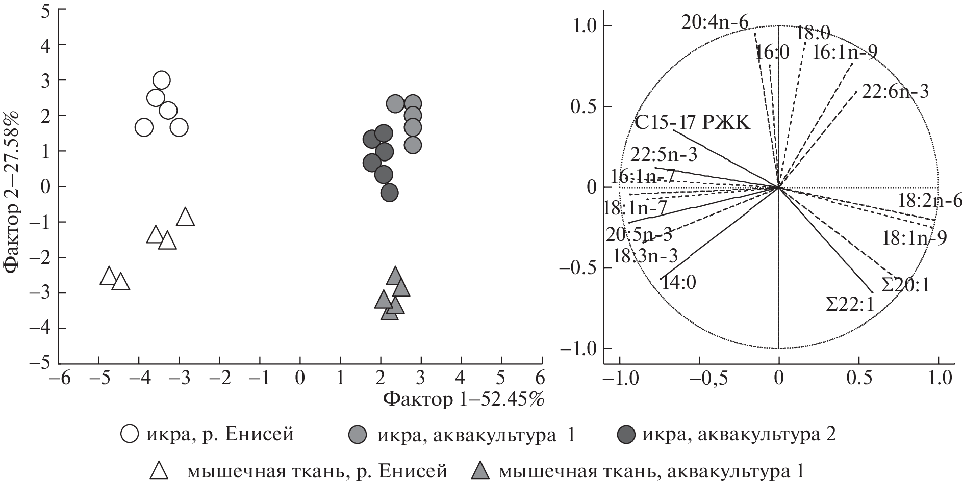 Significant differences were found in the fatty acid composition of roe and muscle tissue (fillet) of starlet (Acipenser ruthenus, Linnaeus, 1758) from Yenisei River and aquaculture farms associated with different food sources. Roe and muscle tissue of sterlet from the natural habitat were characterized by significantly higher levels of fatty acids – biomarkers of diatoms and bacterial matter. Sterlet grown in aquaculture conditions had in the composition of fatty acids significantly higher percentages of oleic and linoleic acids, as well as fatty acids, biomarkers of marine copepods. For the first time, it was proposed to use the calculation of the ratio of the percentage of several biomarker fatty acids and set threshold values for determining the origin of sturgeon roe and fillet from the natural habitat and aquaculture.