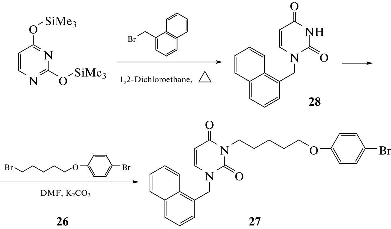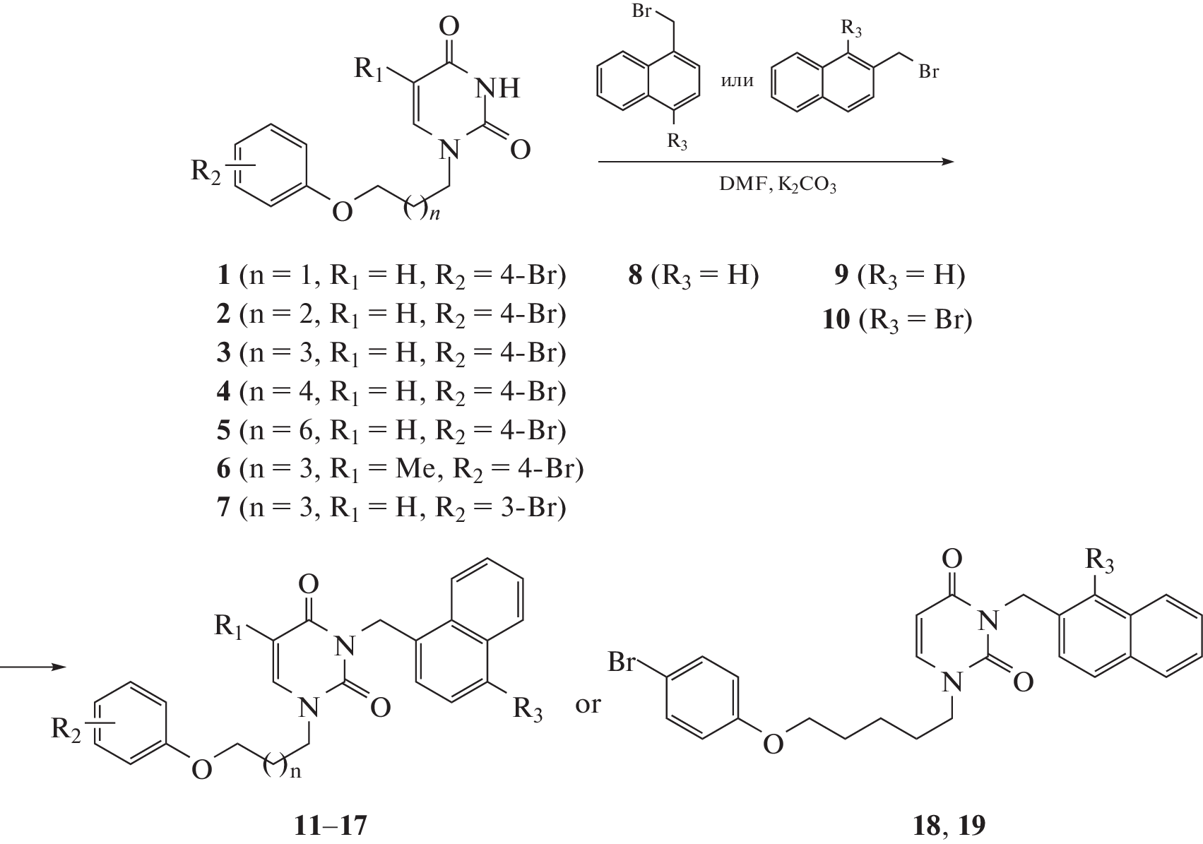 A synthesis of a new series of 1-[ω-(bromophenoxy)alkyl]-uracil derivatives containing in position 3 naphthalen-1-yl-, naphthalen-2-yl-, 1-bromonaphthalen-2-ylmethyl, benzyl, and anthracene 9-methyl fragment was carried out. The antiviral properties of the synthesized compounds were studied against human cytomegalovirus. It was found that the compound, which has in its composition a bridge consisting of five methylene groups, has a high anti-cytomegalovirus activity in vitro.