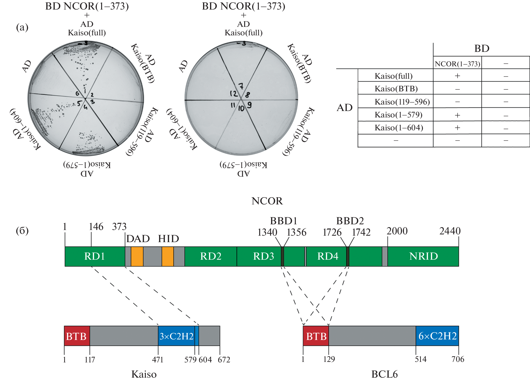 The vertebrate transcription factor Kaiso binds specifically to methylated DNA sequences using C2H2-type zinc fingers. In addition to C2H2-domains, the BTB/POZ domain, which forms homodimers, is located at the N-terminus of Kaiso. Kaiso, like several other well-studied BTB/POZ proteins, including BCL6, interacts with the NCoR (nuclear co-repressor) protein, which determines the landing of transcriptional repressive complexes on chromatin. Using the yeast two-hybrid system, we have shown that the N-terminal domain of NCoR interacts with the C-terminal zinc fingers of Kaiso, and not with its BTB/POZ domain, as previously assumed. The results obtained demonstrate that NCoR interacts with various transcription factor domains, which can increase the efficiency of attracting NCoR-dependent repressor complexes to regulatory regions of the genome.