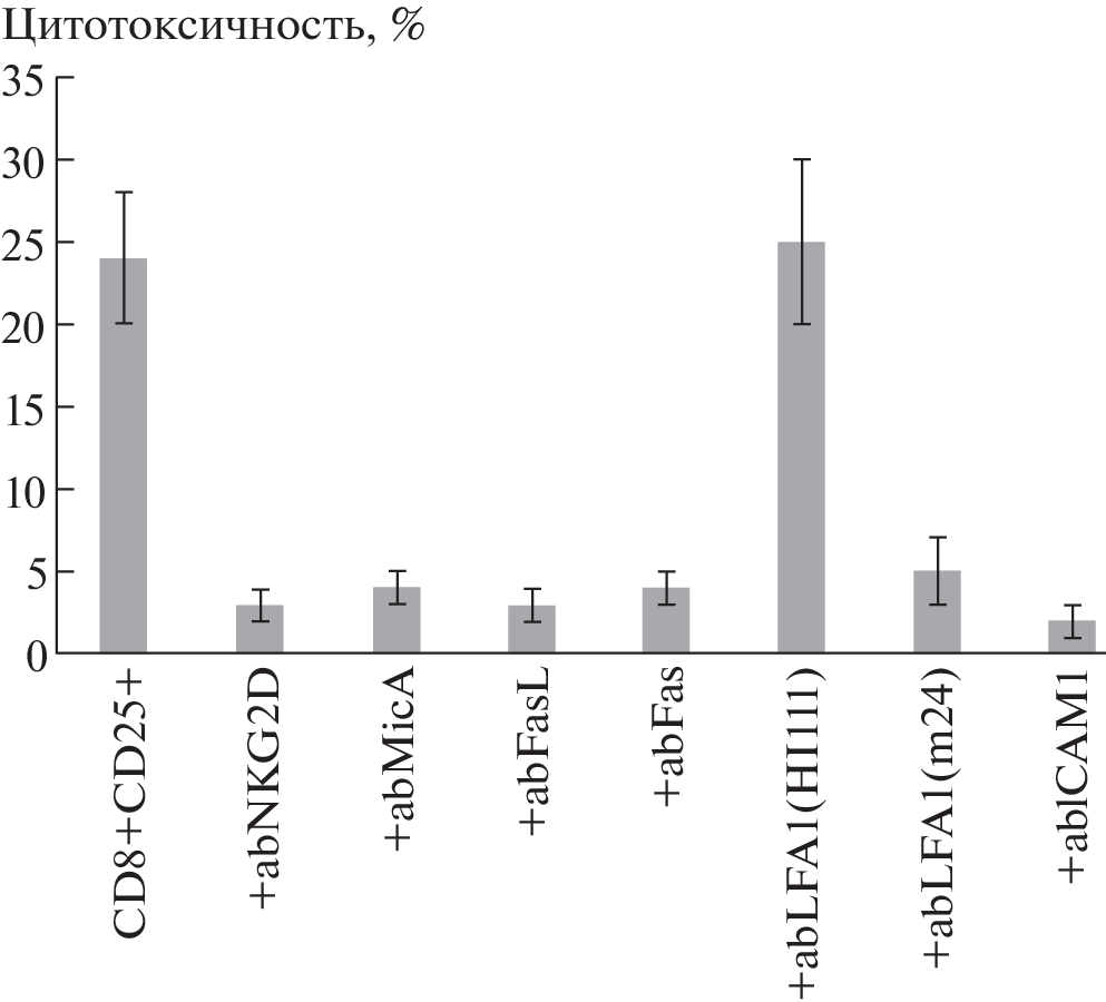 Для осуществления противоопухолевой активности против клеток, потерявших поверхностные антигены, лимфоциты человека должны обладать определенным репертуаром поверхностных белков, способных связаться с опухолевой клеткой и индуцировать в ней программируемую клеточную смерть. В этой работе мы показали, что активация цитокином IL-2 клеток здоровых доноров в течение 6 сут вызывает появление на CD8+CD25+ субпопуляции Т лимфоцитов белков FasL, CD25 и LFA-1, а также переводит белок LFA-1 в активную форму, имеющую высокое сродство к своей мишени, интегрину ICAM-1. Появление этих белков на поверхности данной субпопуляции лимфоцитов позволяет им индуцировать программируемую клеточную смерть в HLA-отрицательных опухолевых клетках.