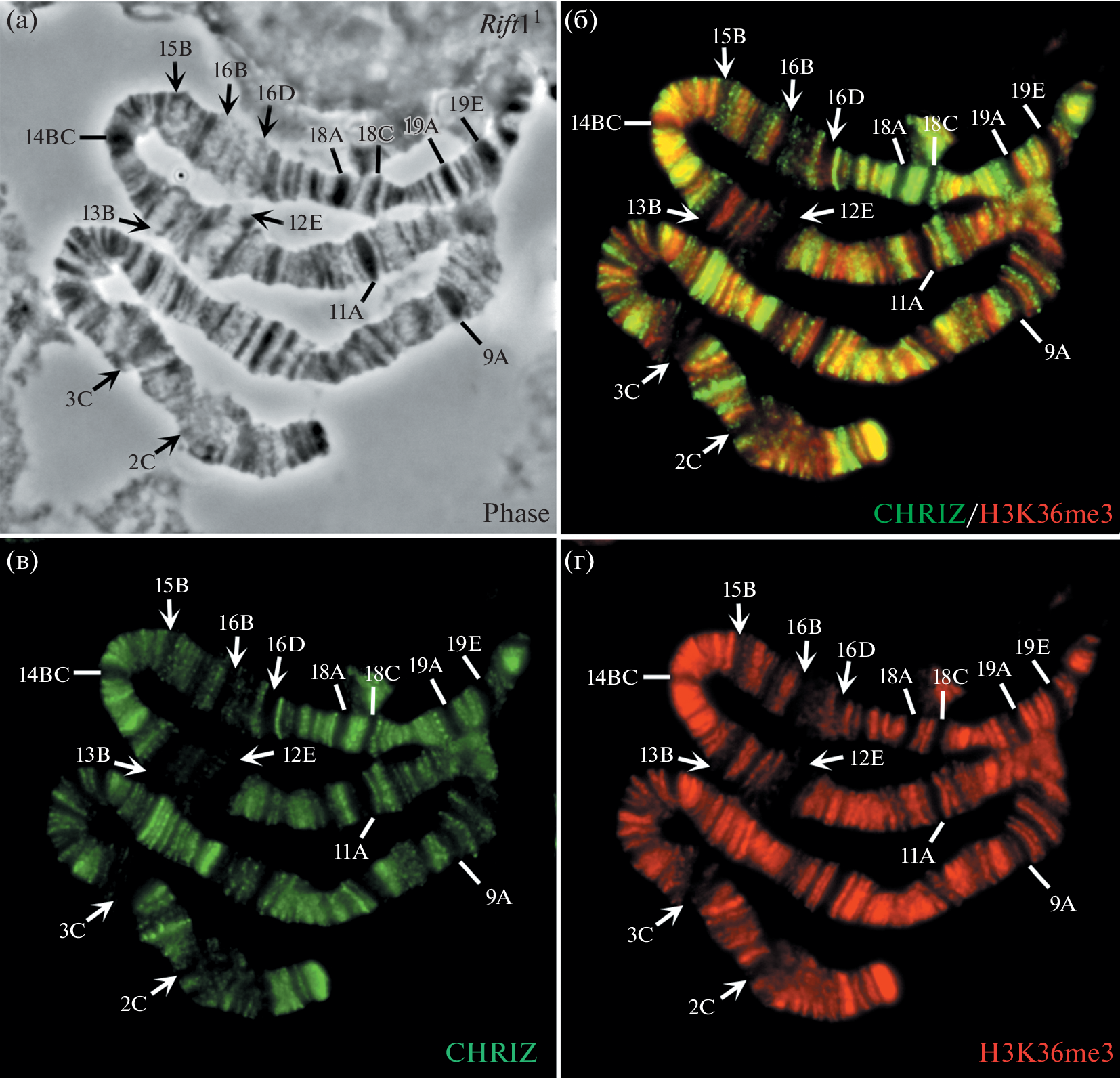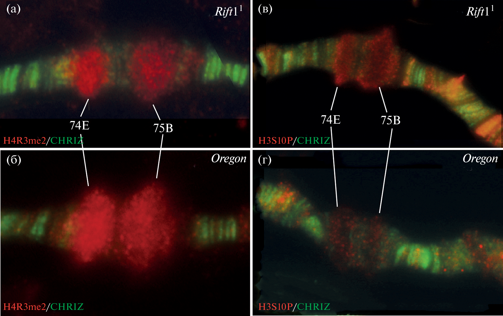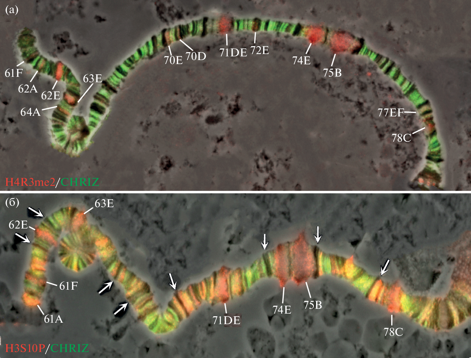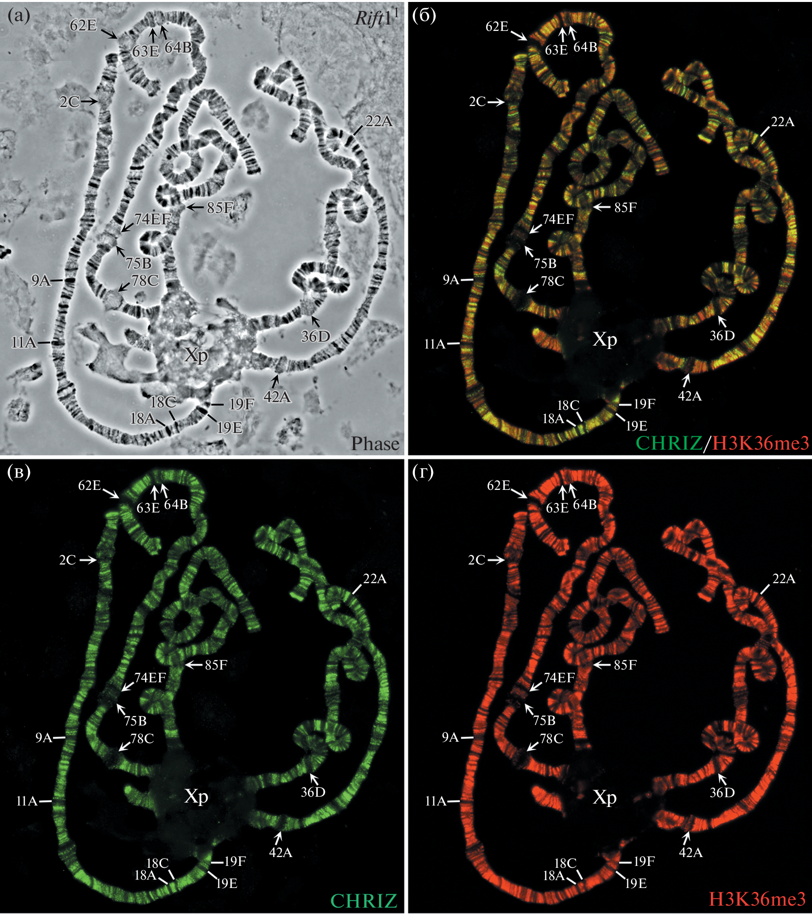 Белки и модифицированные гистоны принимают участие в процессах инициации и элонгации транскрипции в геноме дрозофилы. По данным работы белок CHRIZ (инсулятор хроматина) и гистона H3K36me3 (элонгация РНК) выявляются в участках локализации генов домашнего хозяйства (междиски и серые диски политенных хромосом) и никогда – в районах генов развития (черные диски и в возникающие из них крупные пуфы). Модификация гистона H3S10P, который связывают с начальной элонгацией нити РНК в ходе транскрипции, выявляются исключительно в малых пуфах, но не в участках локализации генов домашнего хозяйства или крупных экдизон-индуцируемых пуфах, в которых локализованы гены развития. Модифицированный гистон H4R3me2 (ко-репрессор экдизонового рецептора) выявляются только в крупных экдизон-индуцируемых пуфах.