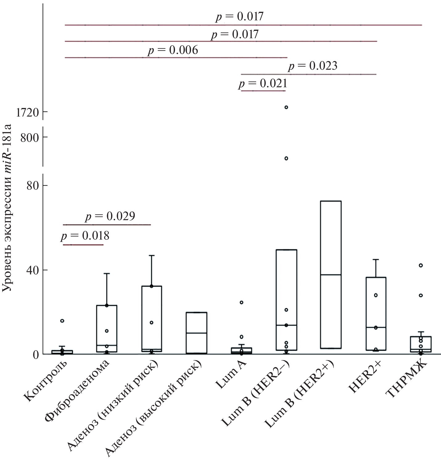 Циркулирующие miR-181а и miR-25, отражающие регуляцию экспрессии генов, вовлеченных в онкогенез, были изучены у пациентов с инвазивной карциномой неспецифического типа (ИКНТ), доброкачественными заболеваниями молочной железы (ДЗМЖ) и у лиц без патологии молочной железы (контроль). Уровень экспрессии miR-181а оказался выше по сравнению с контролем в случае фиброаденомы и аденоза с низким, но не с высоким риском злокачественной трансформации, а также при люминальном HER2-негативном типе B (Lum B HER2-), HER2 позитивном типе (HER2+) и тройном негативном раке молочной железы (ТНРМЖ) по сравнению с контролем и с люминальным типом (Lum A) РМЖ. Уровень miR-25 преобладал при Lum B HER2- в сравнении с контролем, Lum A и ТНРМЖ и при ТНРМЖ в сравнении с контролем и Lum A. Уровни экспрессии miR-181а и miR-25 могут быть индикаторами вероятности малигнизации у пациентов с ДЗМЖ, а у пациентов с ИКНТ отражают разнонаправленные процессы в опухоли.